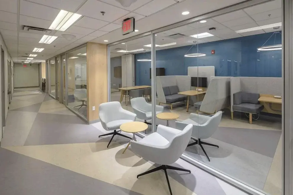 Founded in 2019, the Cornell Center for Social Sciences unites programmatic and infrastructure resources within the Office of the Vice Provost for Research and Innovation. These programs foster systematic, evidence-based, and collaborative research studies addressing important disciplinary, interdisciplinary, and public policy concerns. This project included a renovation for the Cornell Center for Social Sciences offices for a multi-disciplinary working group. The project included an administrative space, a large meeting room/lecture hall, and a pantry with space for informal/ad hoc meetings. The project also accommodated one of the first gender-inclusive restrooms on campus. All spaces included state-of-the-art AV and collaborative IT systems.